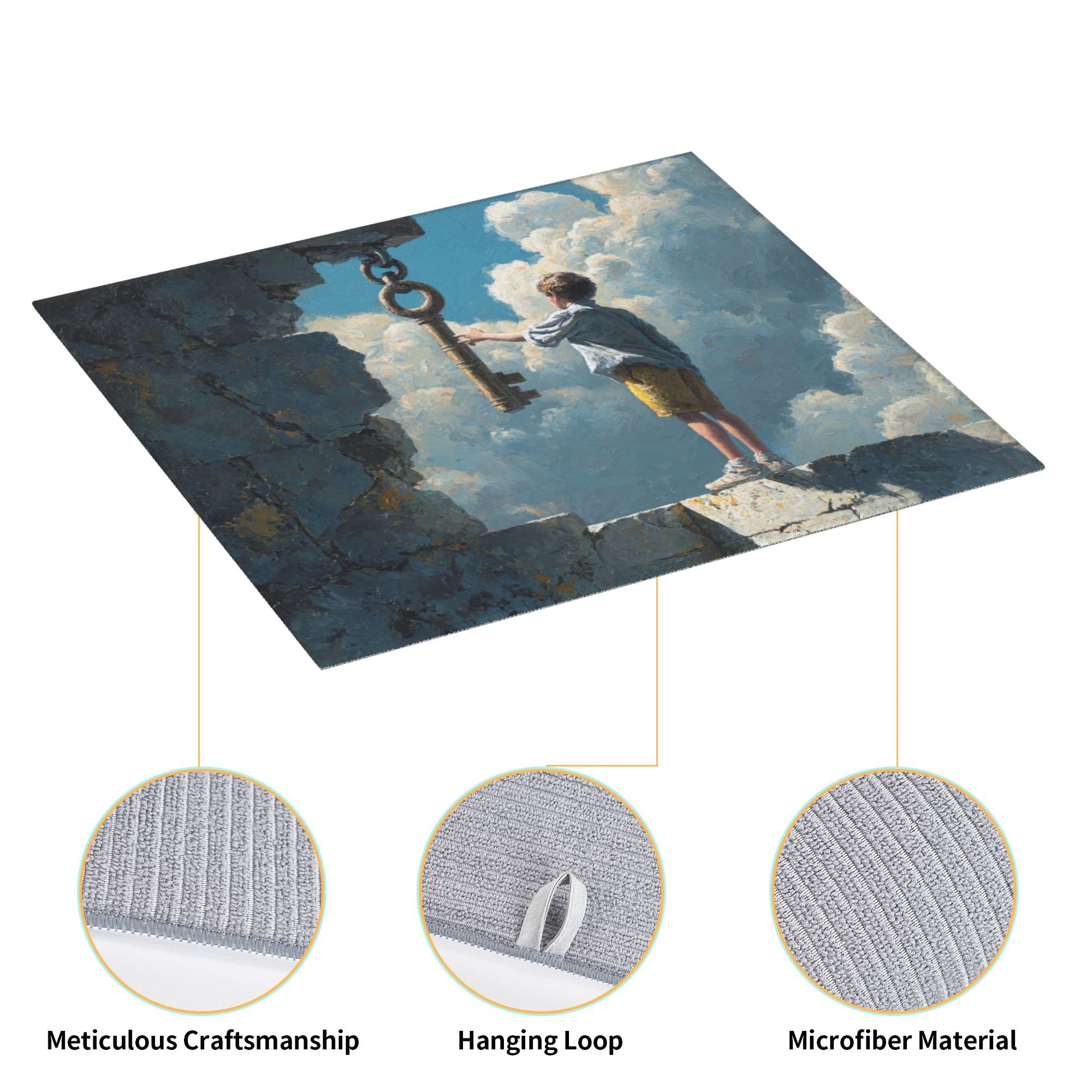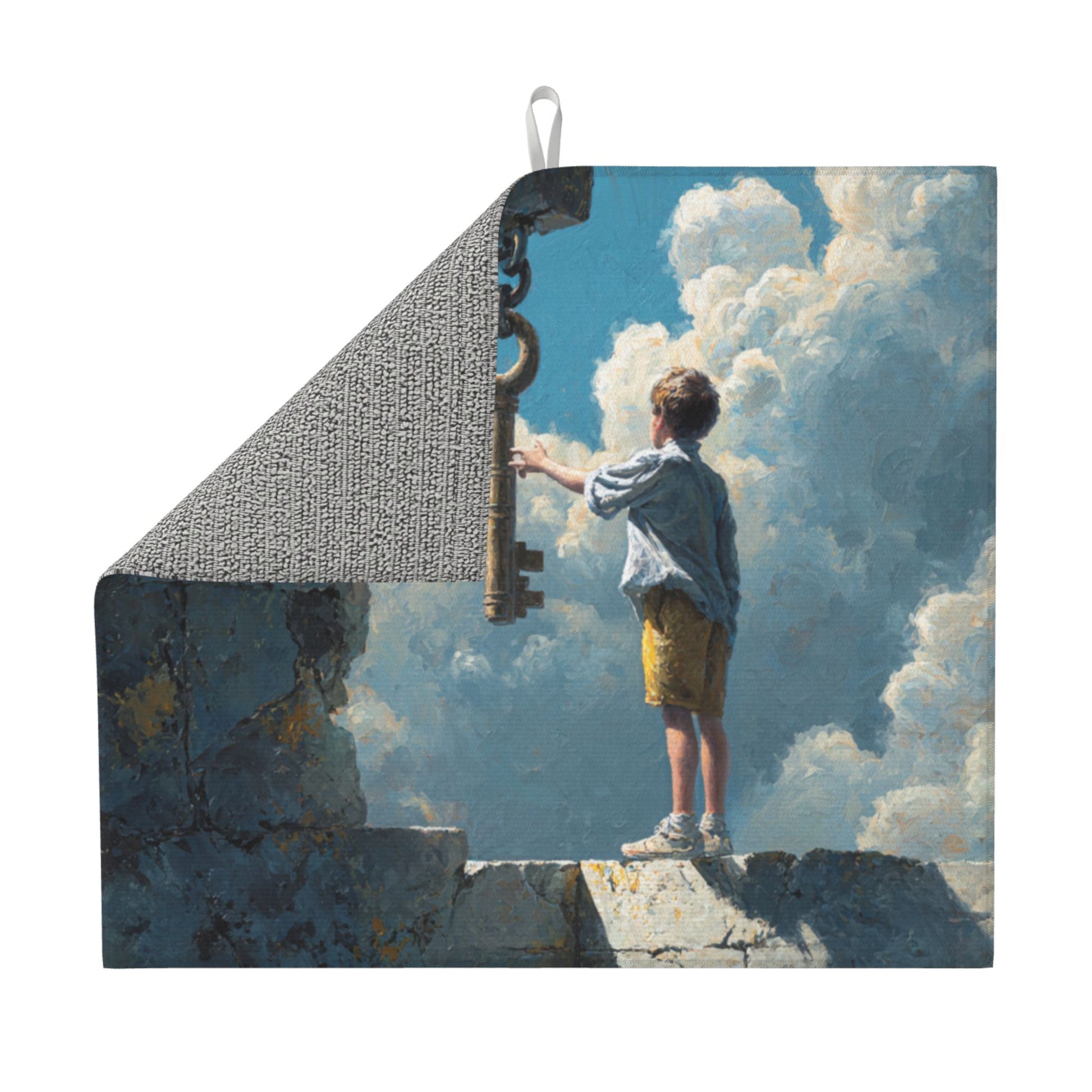 Unlock the doorway to dreams with this imaginative Dream Gate Kitchen Drying Mat. Featuring a young boy reaching toward a giant antique key suspended in the sky, surrounded by expansive clouds, this design stirs a sense of childhood wonder, curiosity, and the limitless possibilities of imagination.