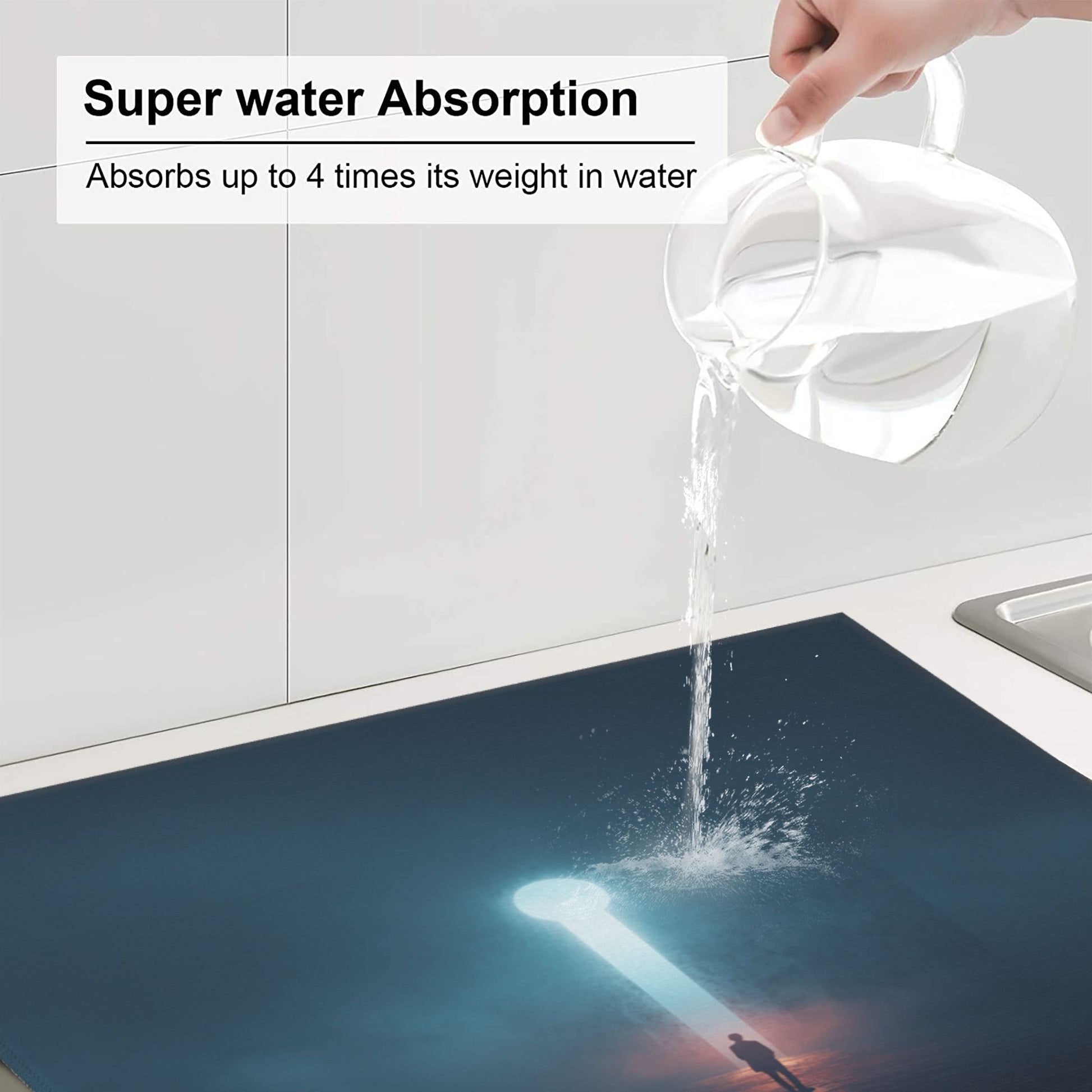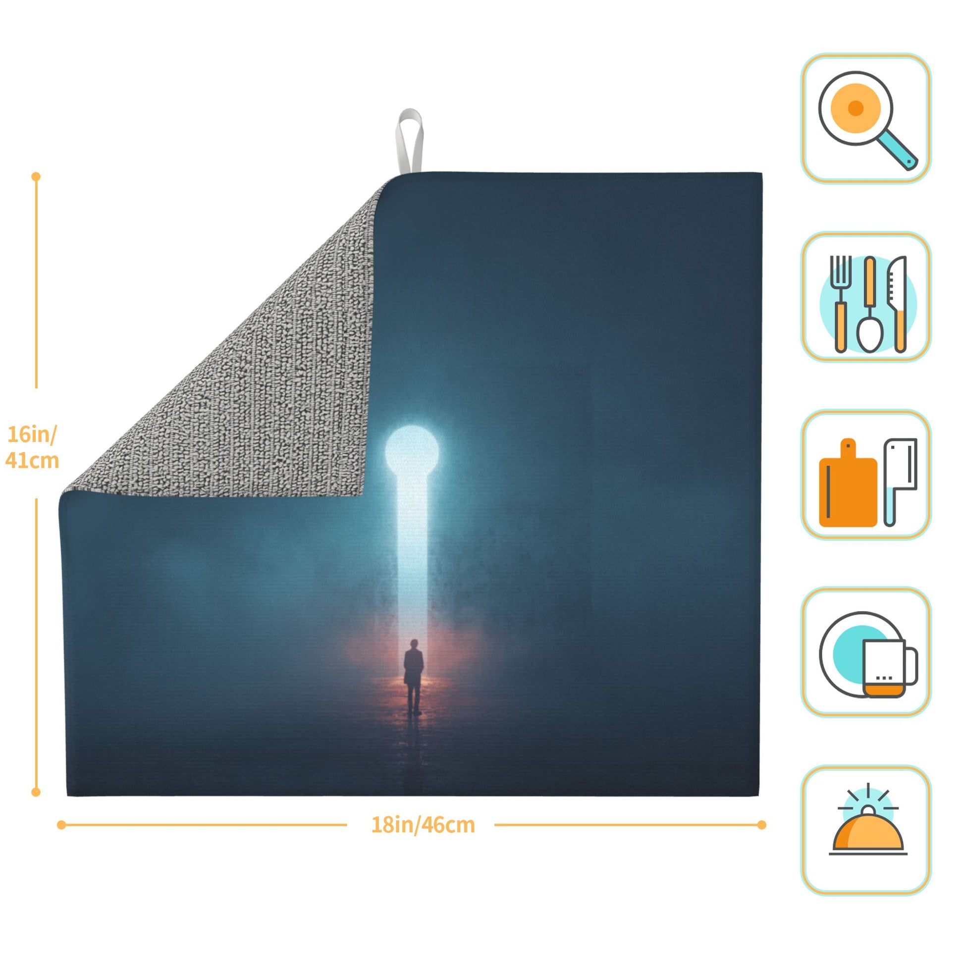 Enter a world of mystery and self-discovery with this Portal of Light Kitchen Drying Mat, where a solitary figure stands beneath a towering keyhole-shaped light beam piercing through a foggy void. It is not just a mat—it’s a philosophical statement. Whether you're drying dishes or decorating your space, this mat brings meaning and modern artistry to your everyday environment.
