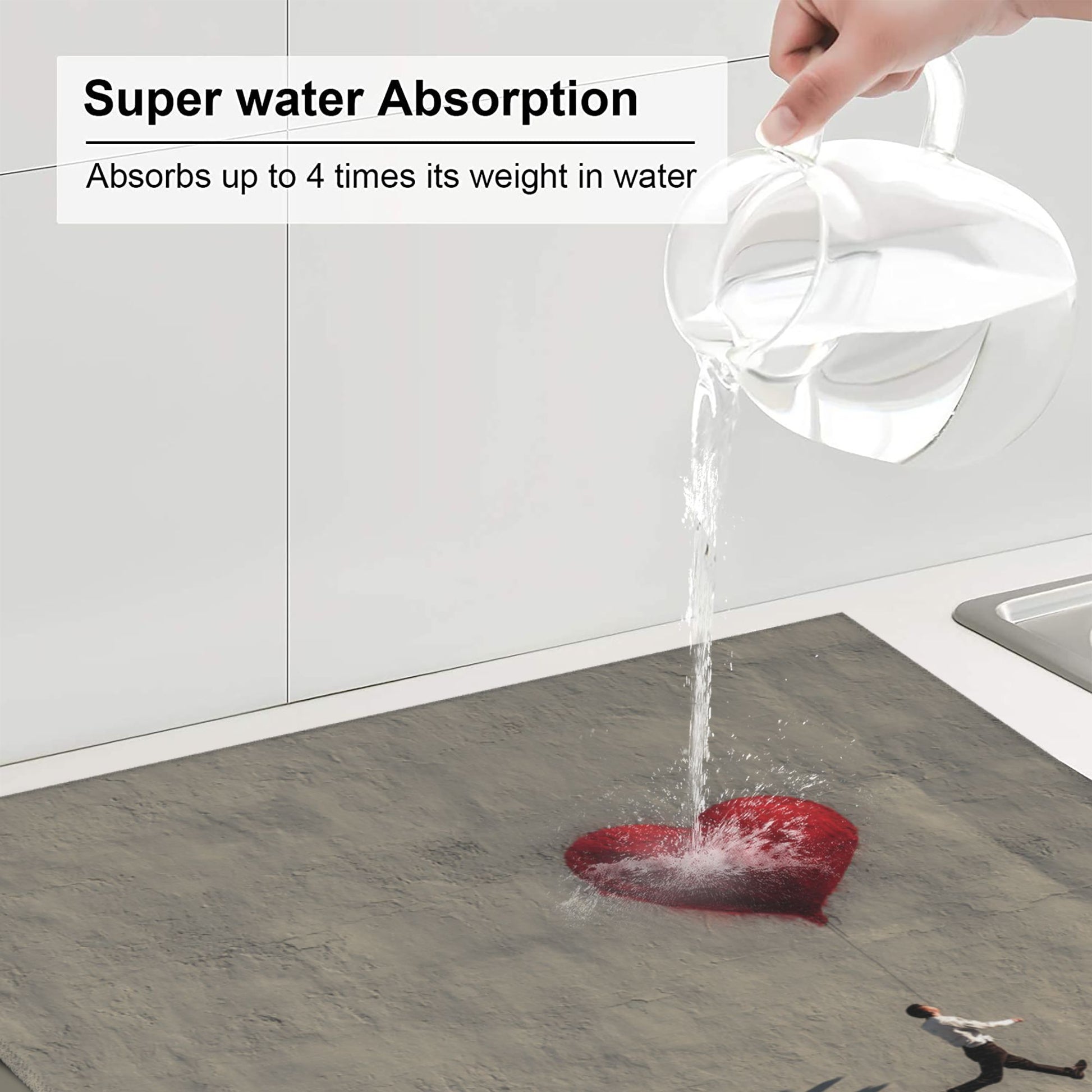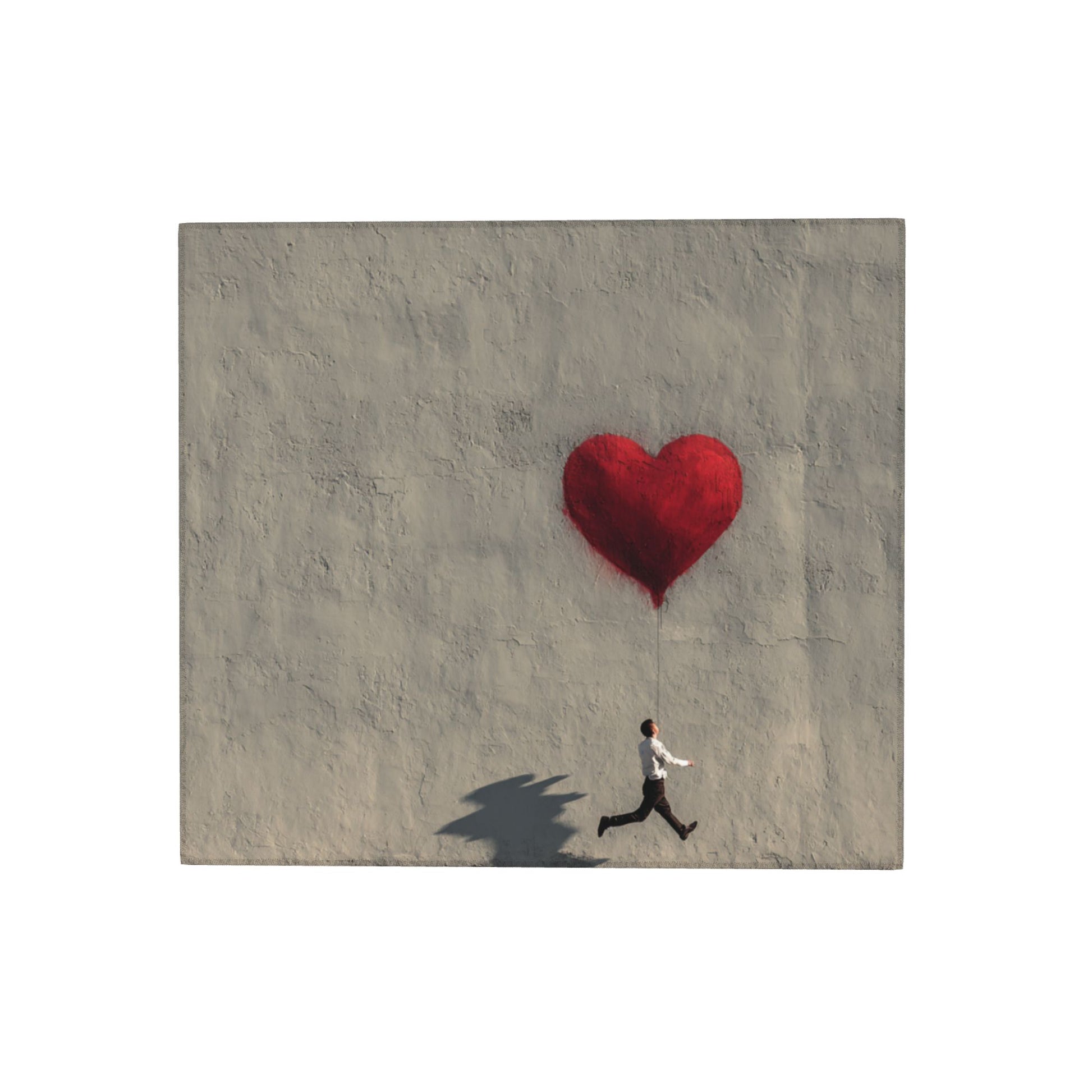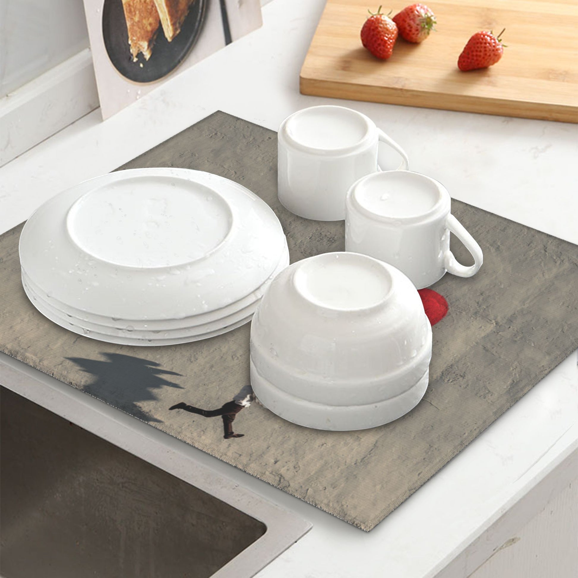 Infuse your kitchen with whimsical charm and artistic expression using this Running Man with Heart Balloon Drying Mat. A surreal yet poetic image—where a man runs forward, holding onto a heart-shaped balloon floating against a concrete-textured wall—adds a tender narrative to your kitchen routine.