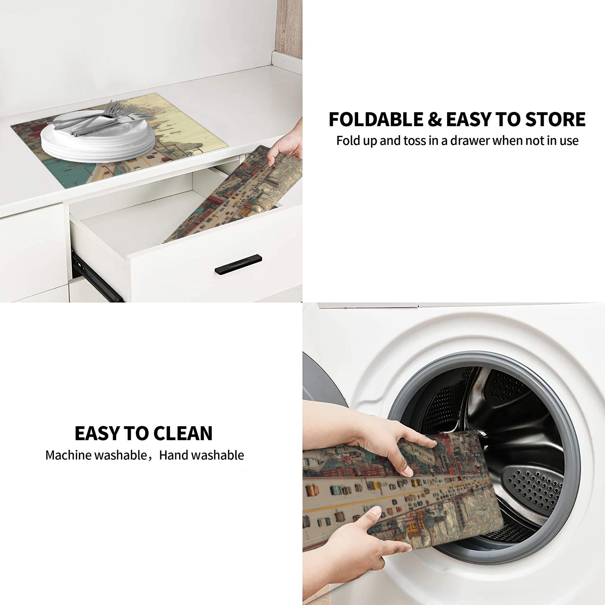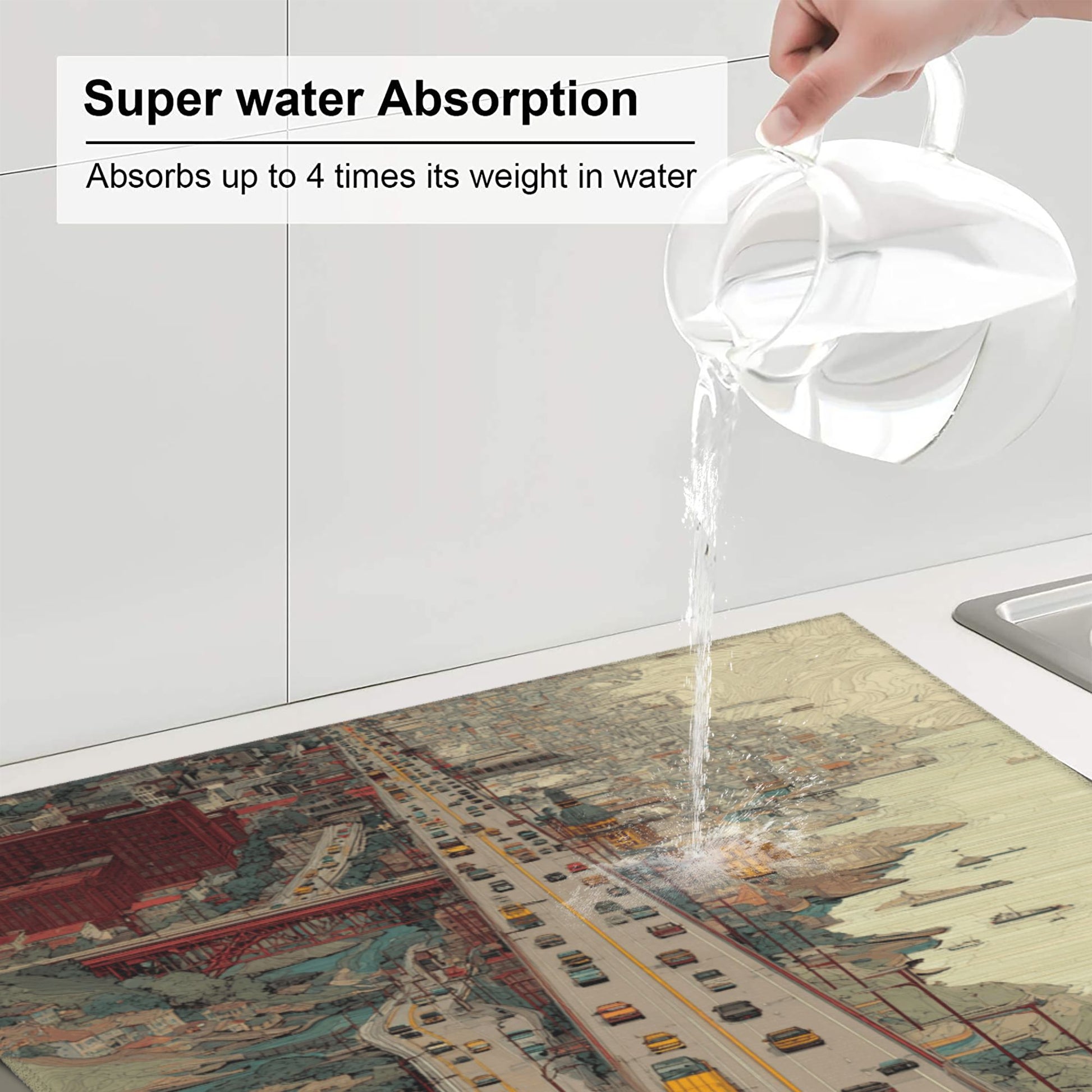 Urban Bridge Art Kitchen Drying Mat – Retro City Illustration Style 18×16in