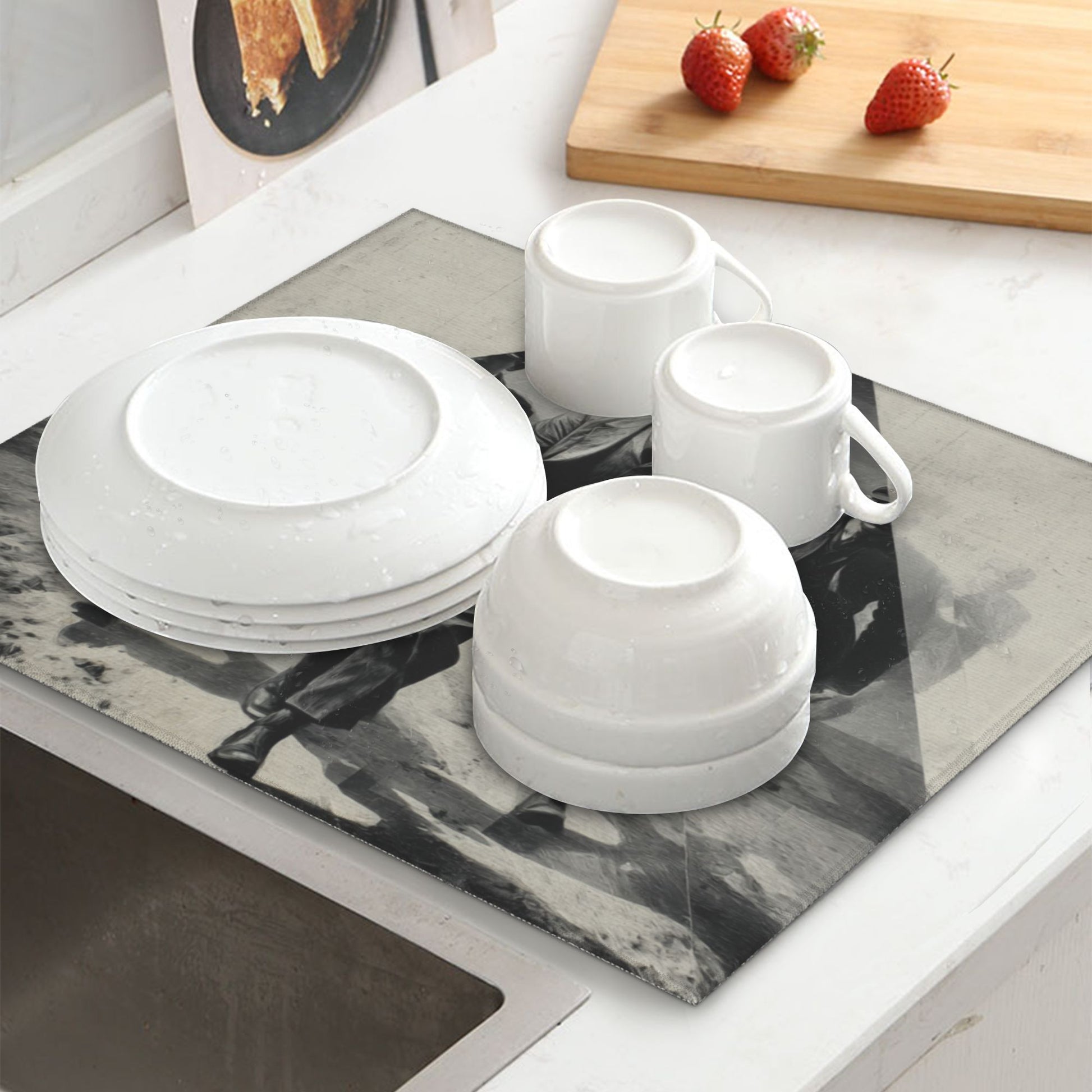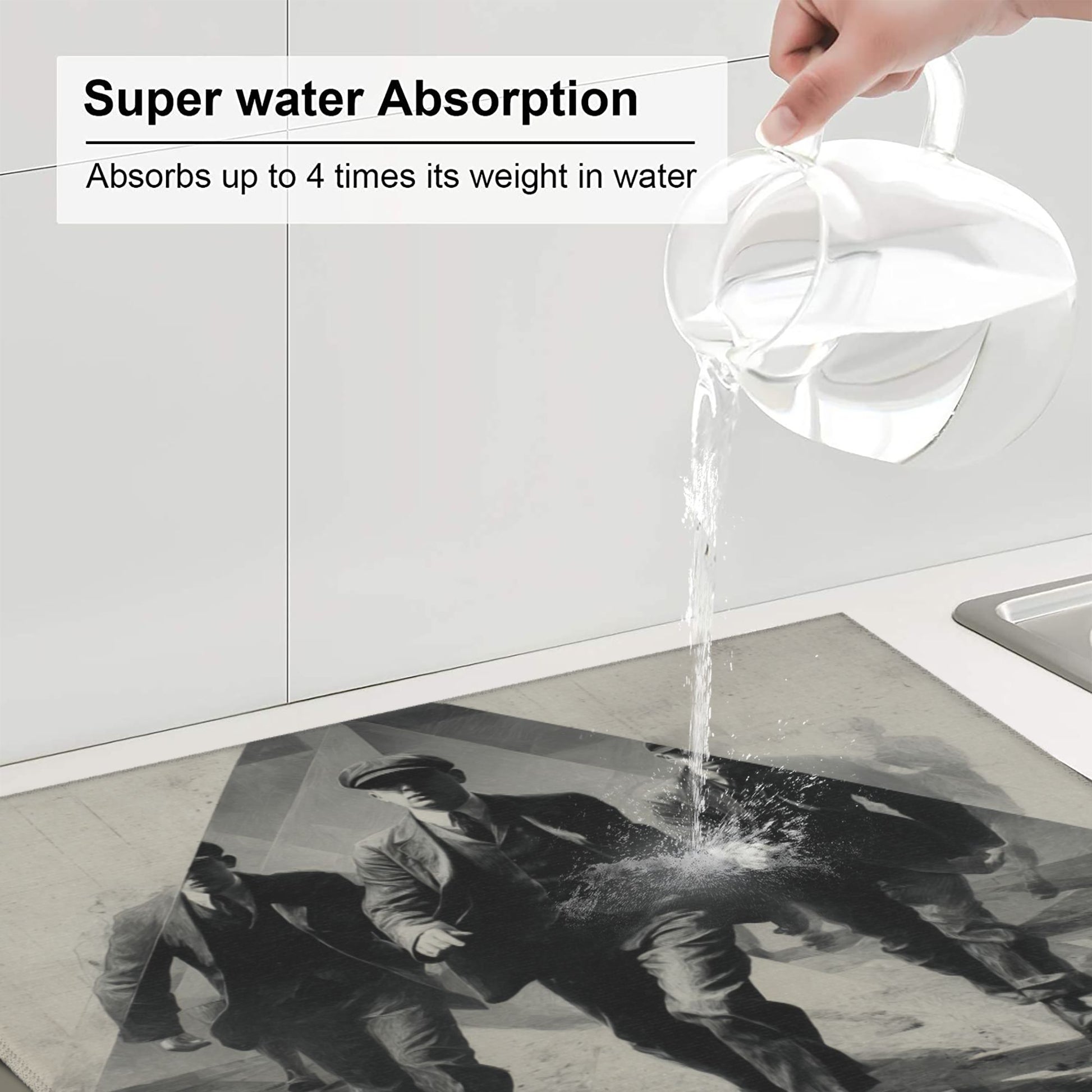 Channel the spirit of vintage elegance and collective strength with this Vintage Gentlemen Walk Kitchen Drying Mat, featuring a dramatic black-and-white scene of suited men walking forward with purpose. The visual storytelling evokes the aura of early 20th-century English gangs, classic noir cinema, and retro sophistication. It's a piece that elevates your kitchen or workspace with masculine charm and visual gravity.